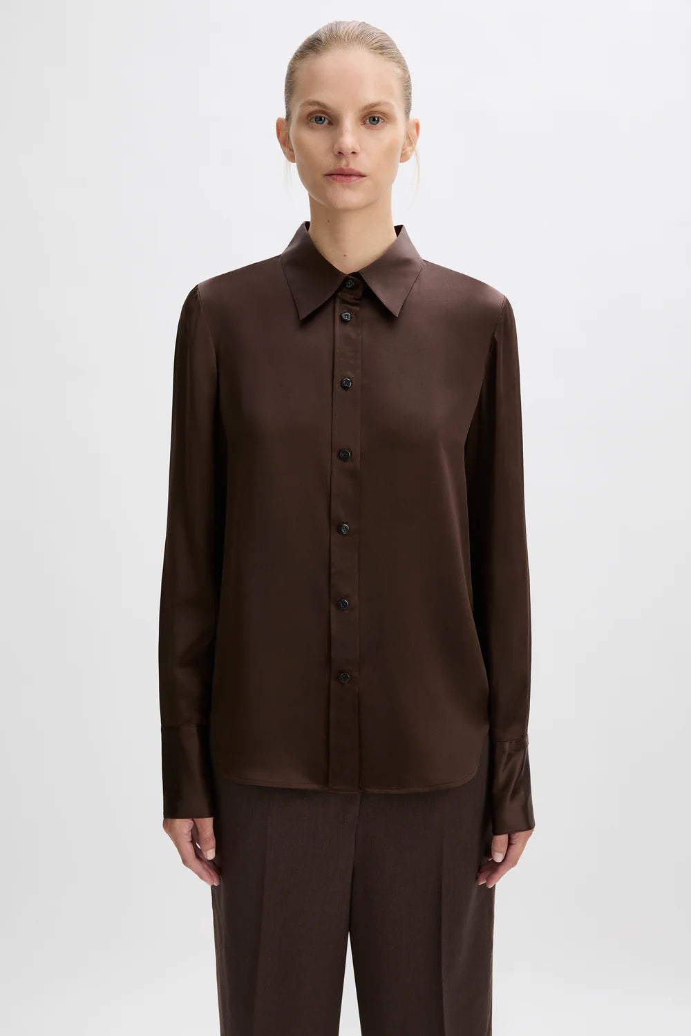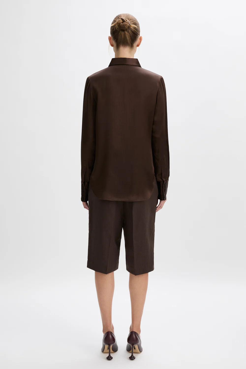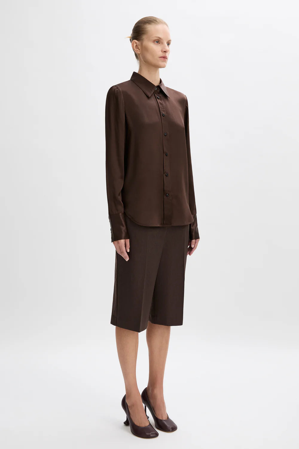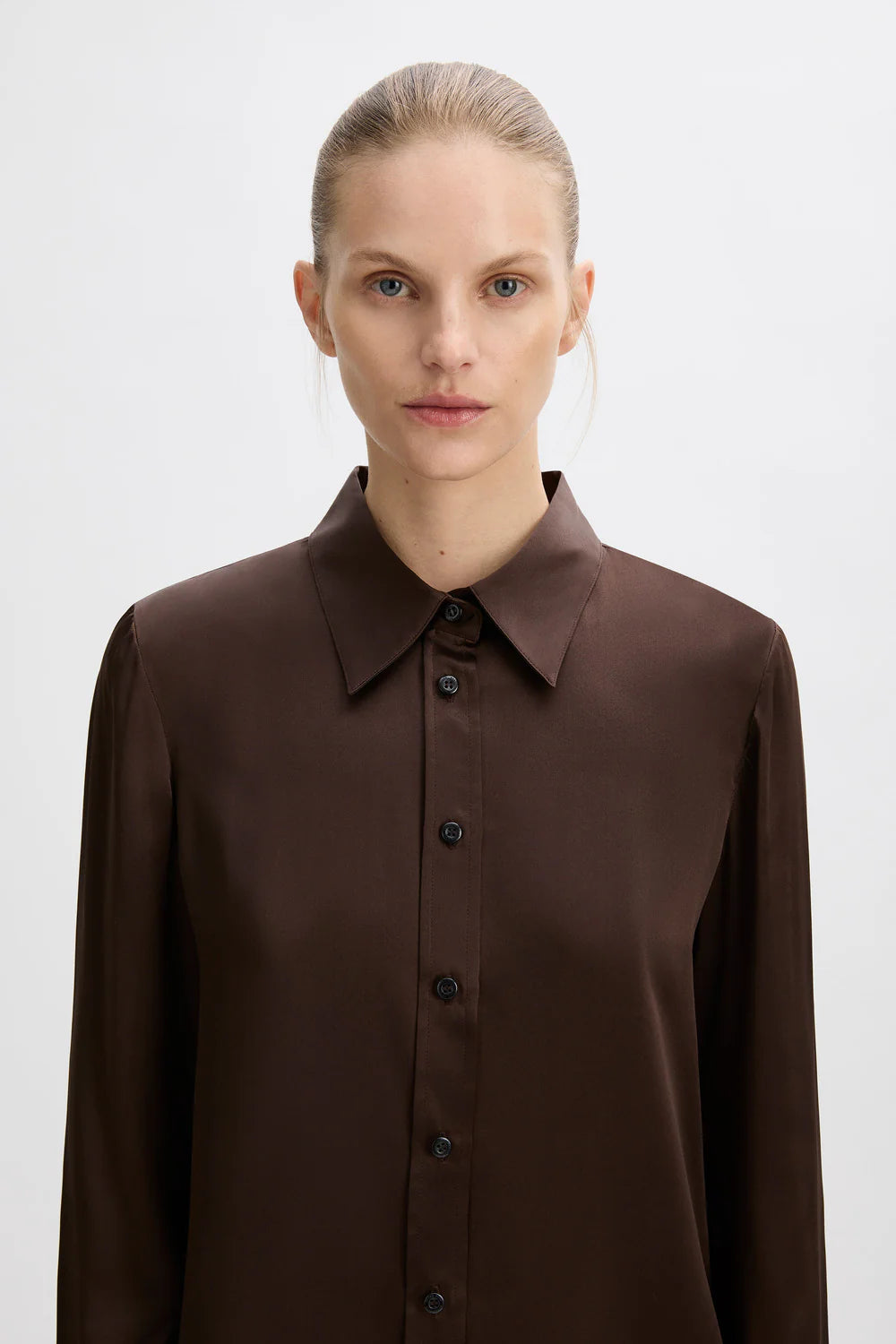 The Emile Blouse in Burgundy is cut from 100% silk satin into a slimline silhouette featuring a wide cuff and shaped collar. Decorated with custom Beare Park engraved buttons.Made in Sydney, Australia.