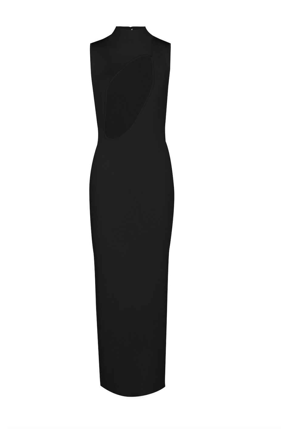 Knitted dress made of ribbed material with oval cut-outs on the chest. Features a turtleneck, rib collared buttons in the the back. Get ready to shine with this sexy elegant dress.