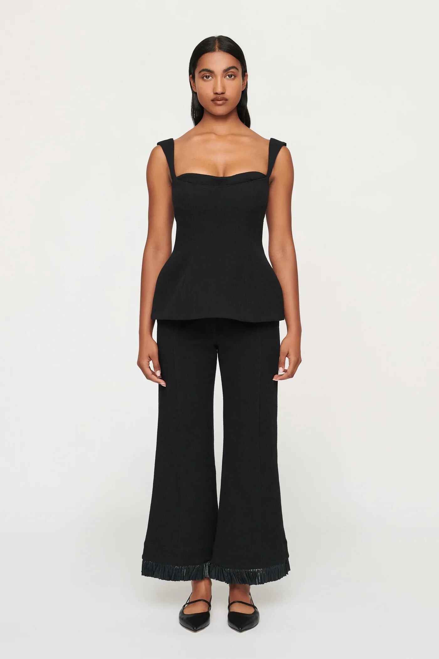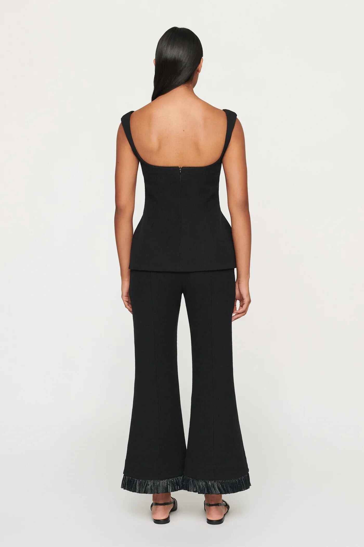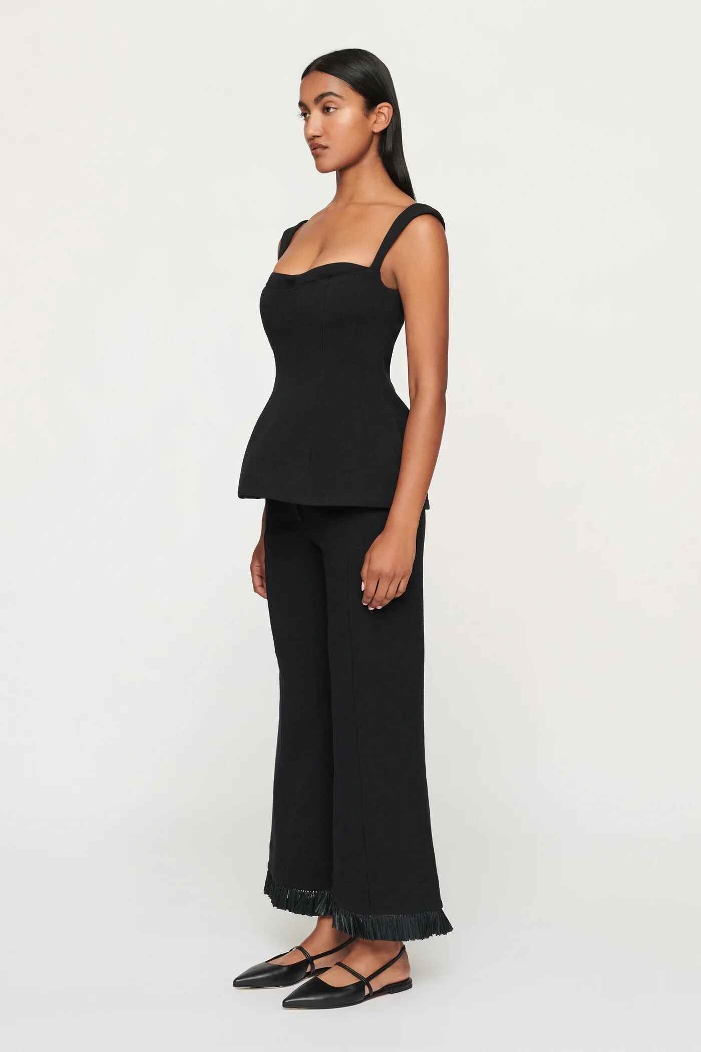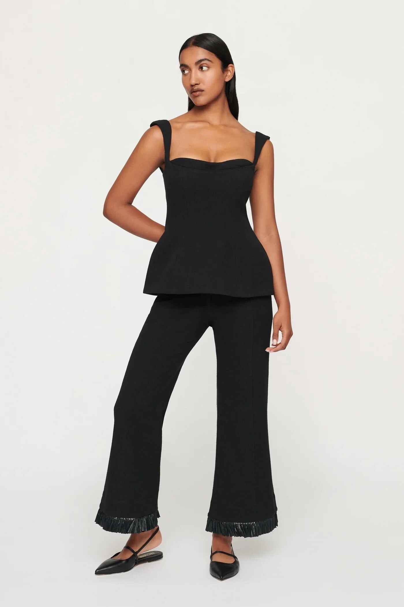 Beautifully crafted in a beautiful textural cotton linen blend. This perfectly tailored trouser features mid-rise silhouette with pintucks down the center of the leg and stunning raffia fringing at the hem of the pants. They have a fly front closure with a clean waistband and a bespoke large button fastening. Fully lined pockets at the side seam. This piece pairs perfectly with the Simona Top and Toledo Blazer for a matching set.