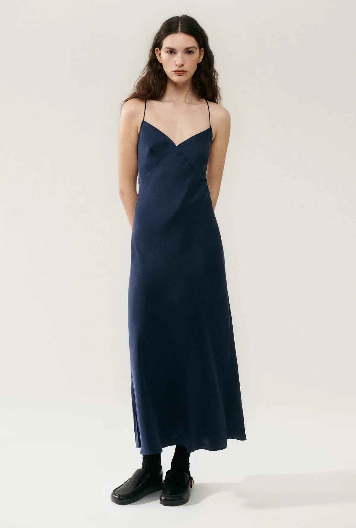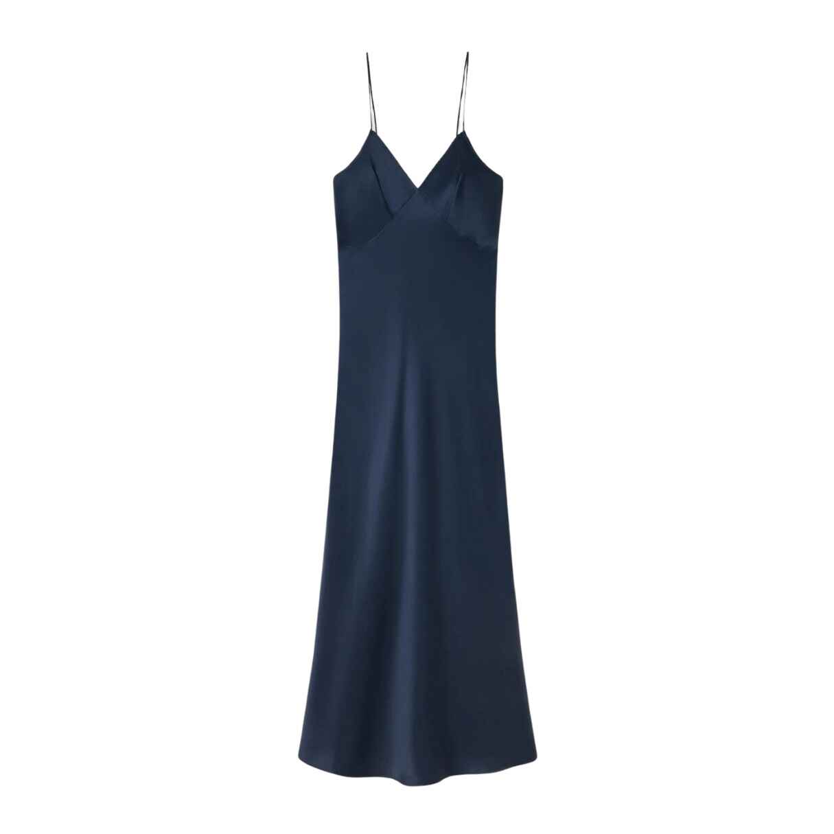 Silk Laundry bias cut dress crafted in 100% silk detailed with a subtle coiled strap, soft triangle panels, and a deep v-neckline. Cut on the bias to a regular fit and ankle-length hemline.