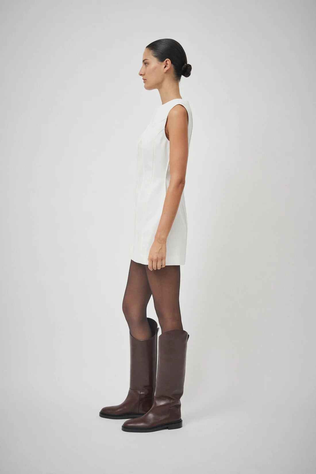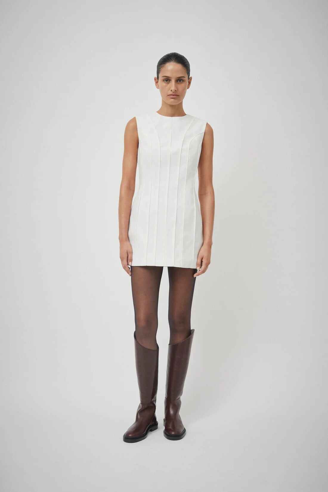 Crafted from ivory drill and fully lined, the panelled mini dress is defined by curved hand stitched seam detailing. Features invisible zip closure. Fabric sourced from Japan.