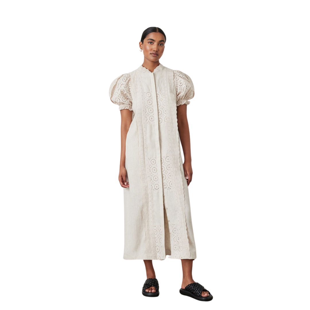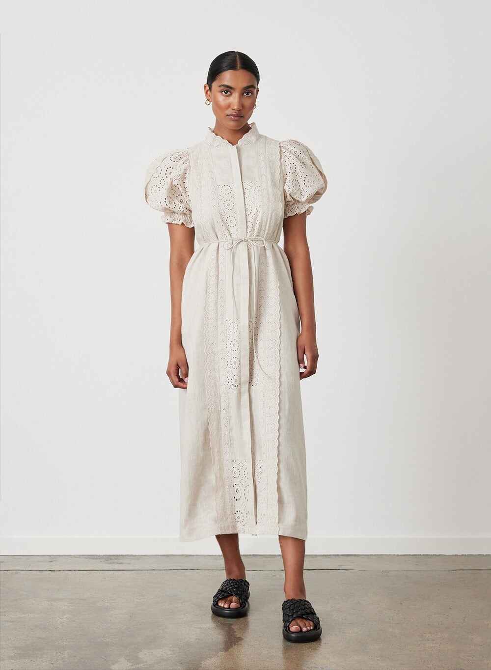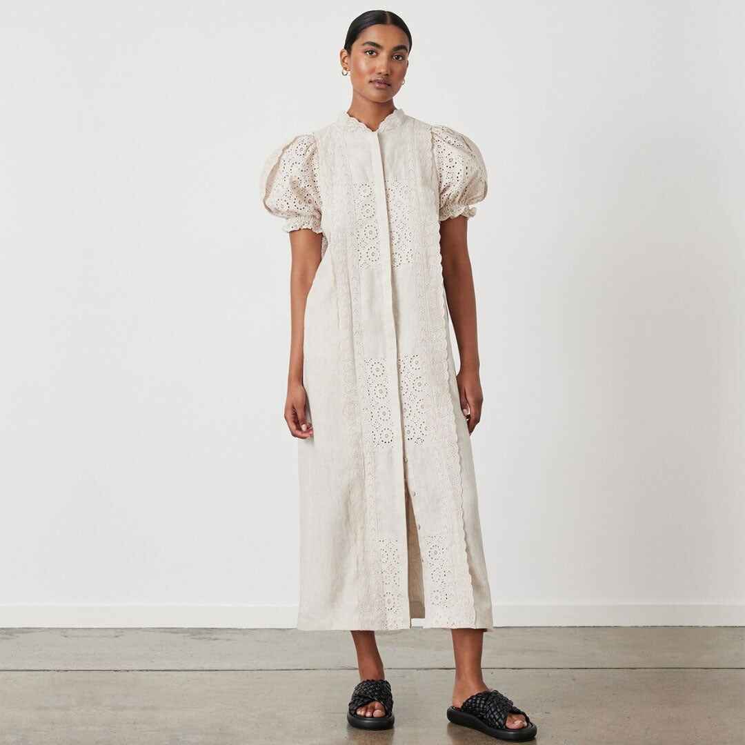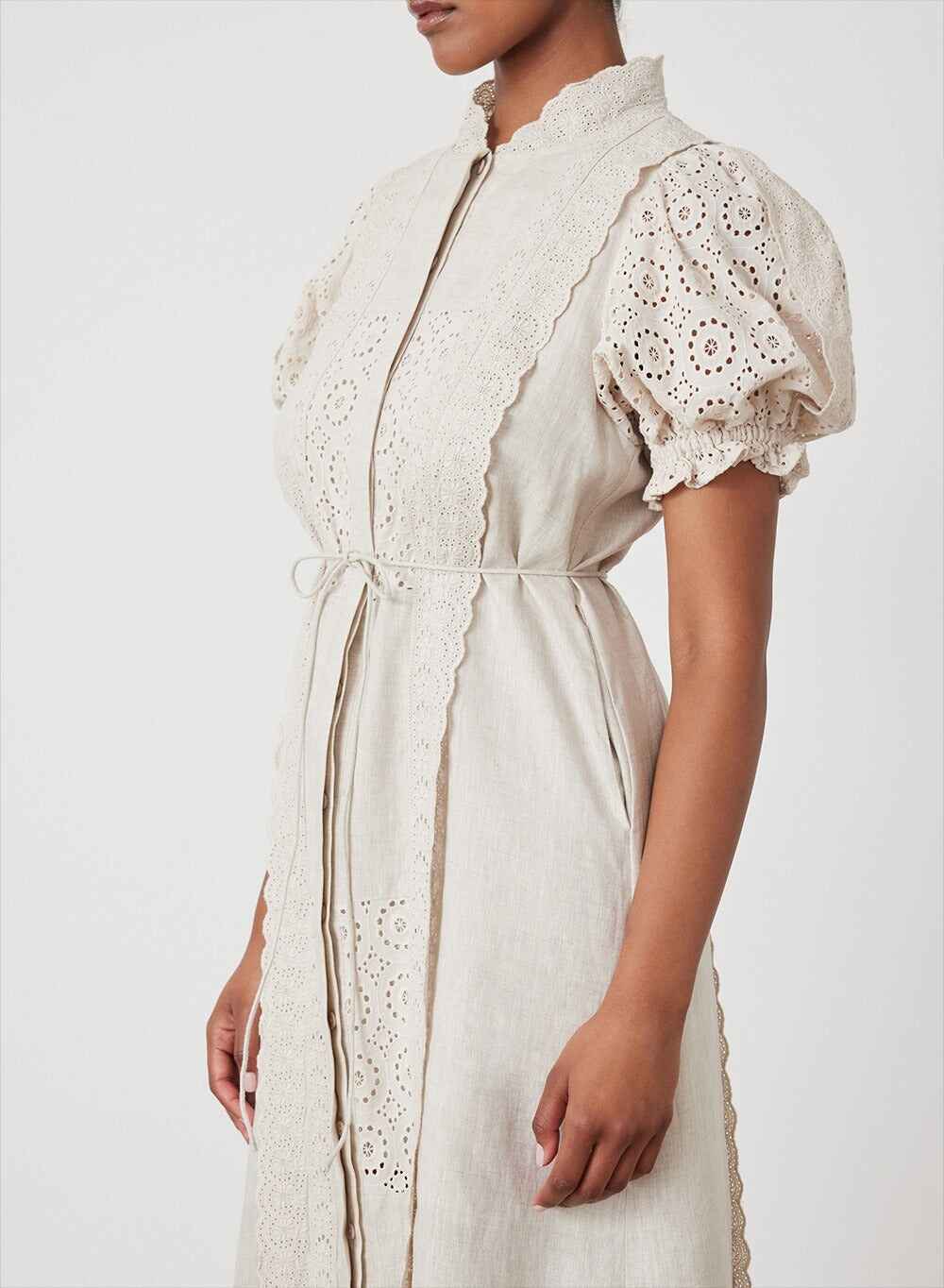 A stunning midi shirt dress with romantic and feminine touches of cotton broderie anglaise and framed in cotton cluny lace.