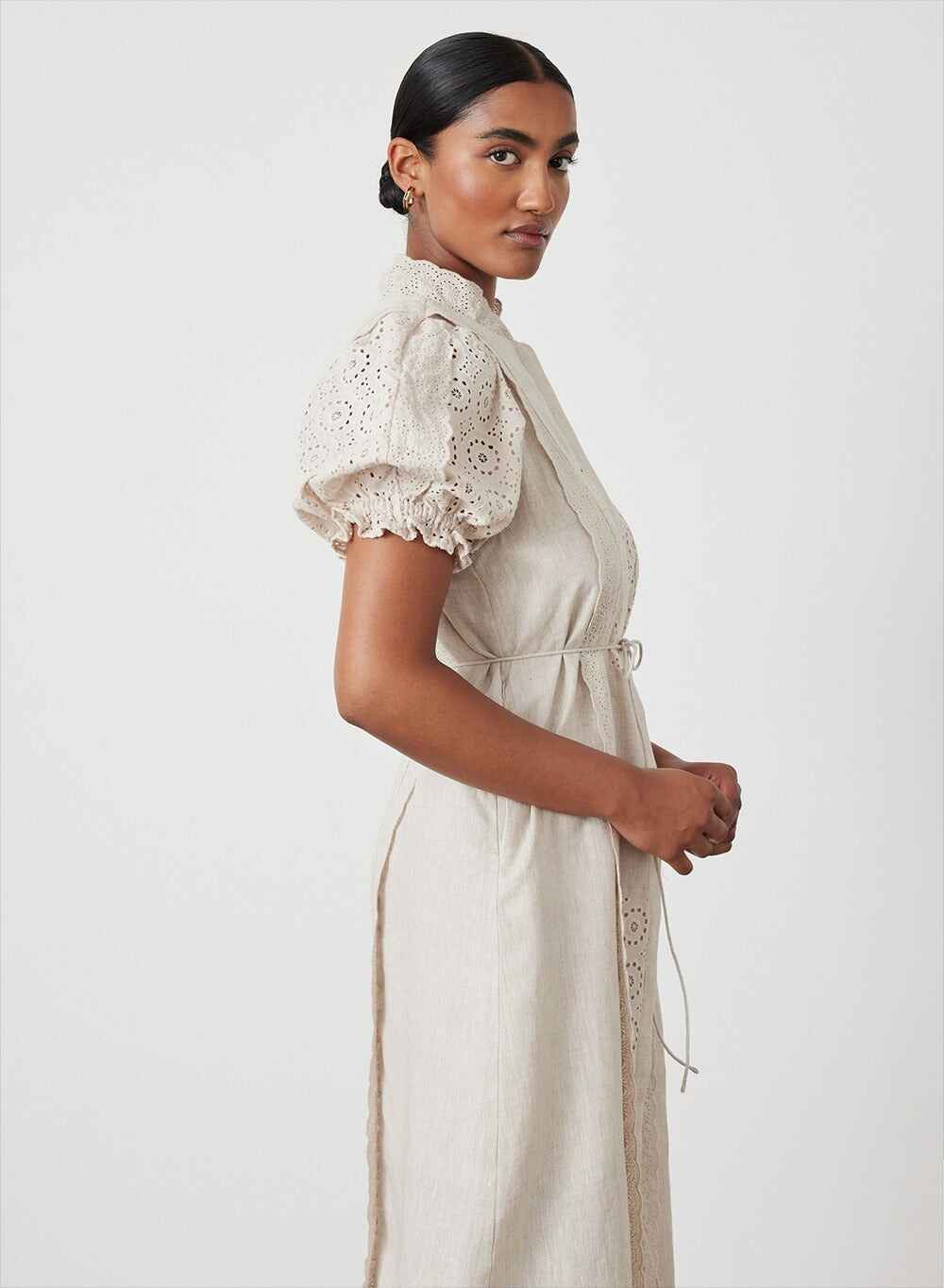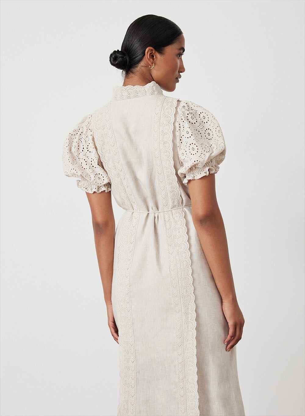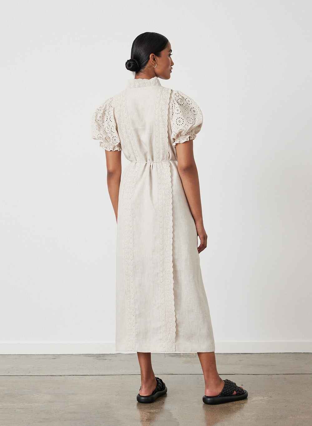 A stunning midi shirt dress with romantic and feminine touches of cotton broderie anglaise and framed in cotton cluny lace.