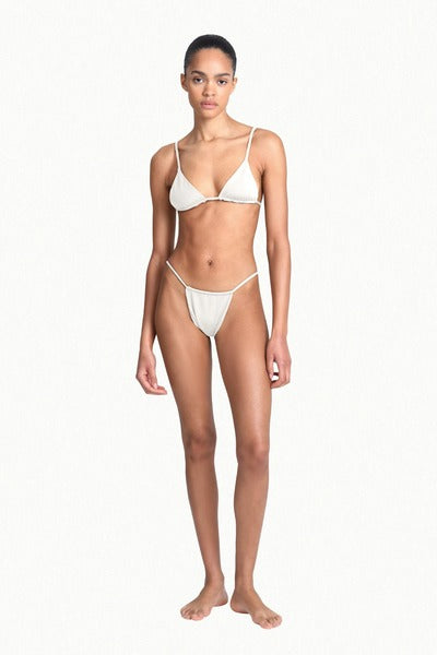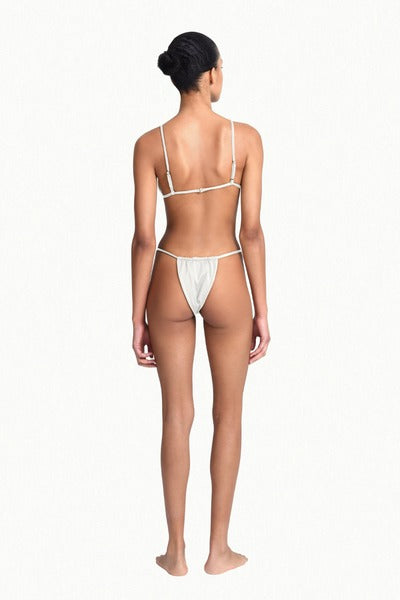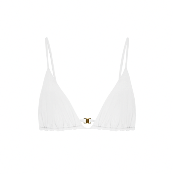 triangle cut top with matte gold hardware, adjustable straps and clip.