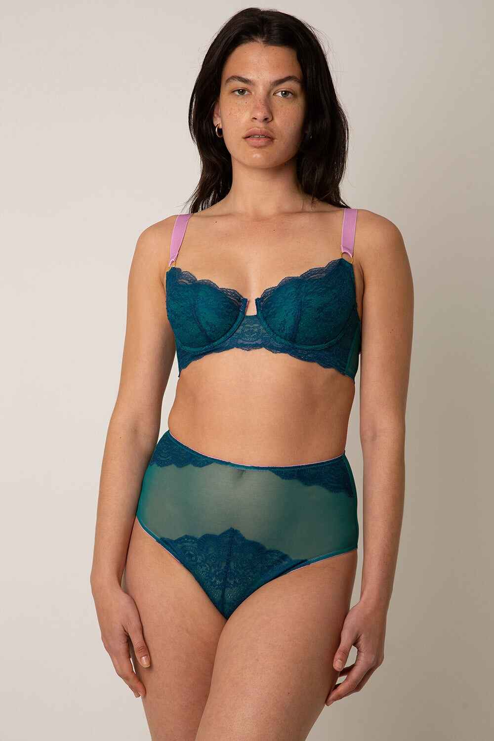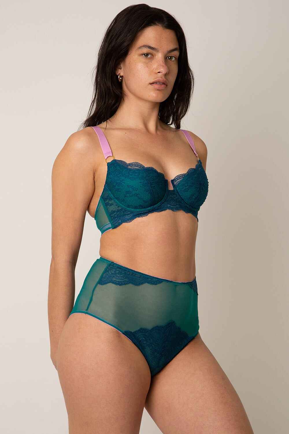 The lace, thread, metal hardware and side boning in our Balconette Bra are all produced using recycled materials. The fabrics are also OEKO-TEX certified, which means they are dyed without the use of harmful chemicals that are toxic to the environment.
