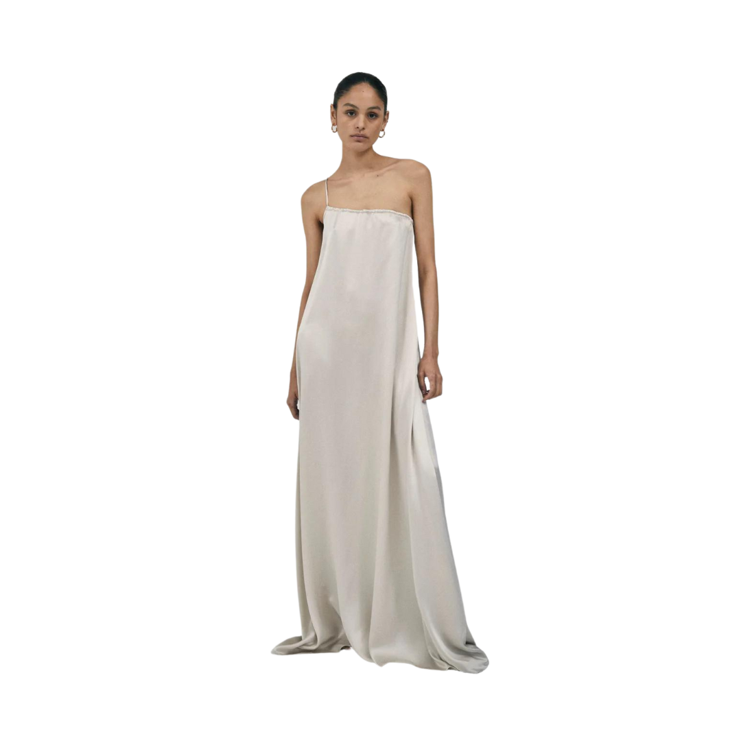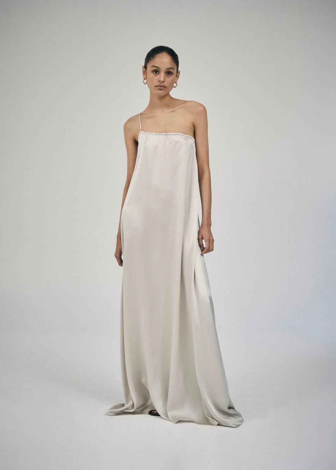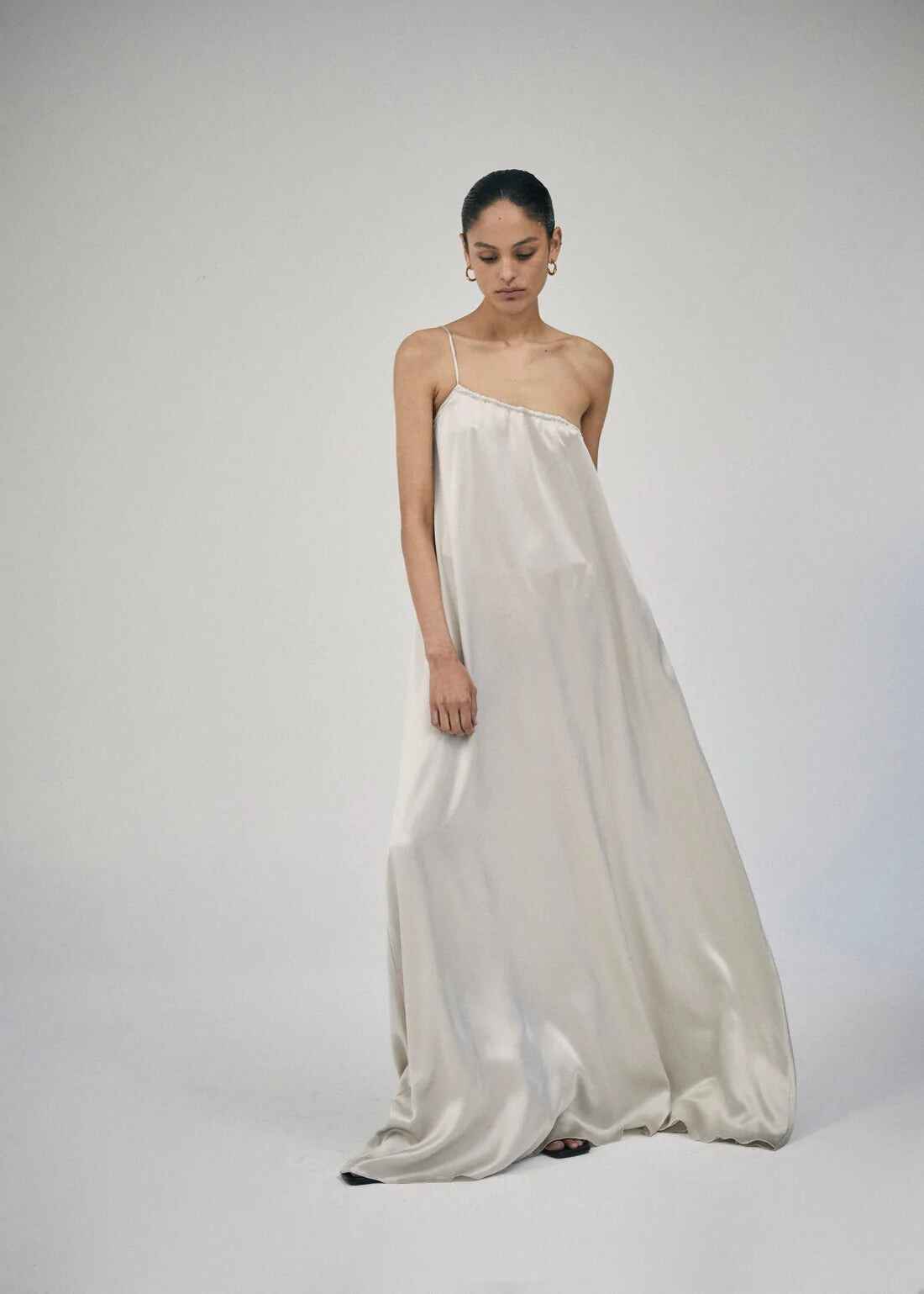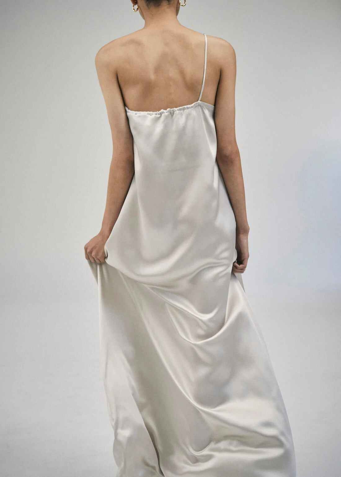 Silk single-strap dress with drawstring detail and voluminous silhouette
