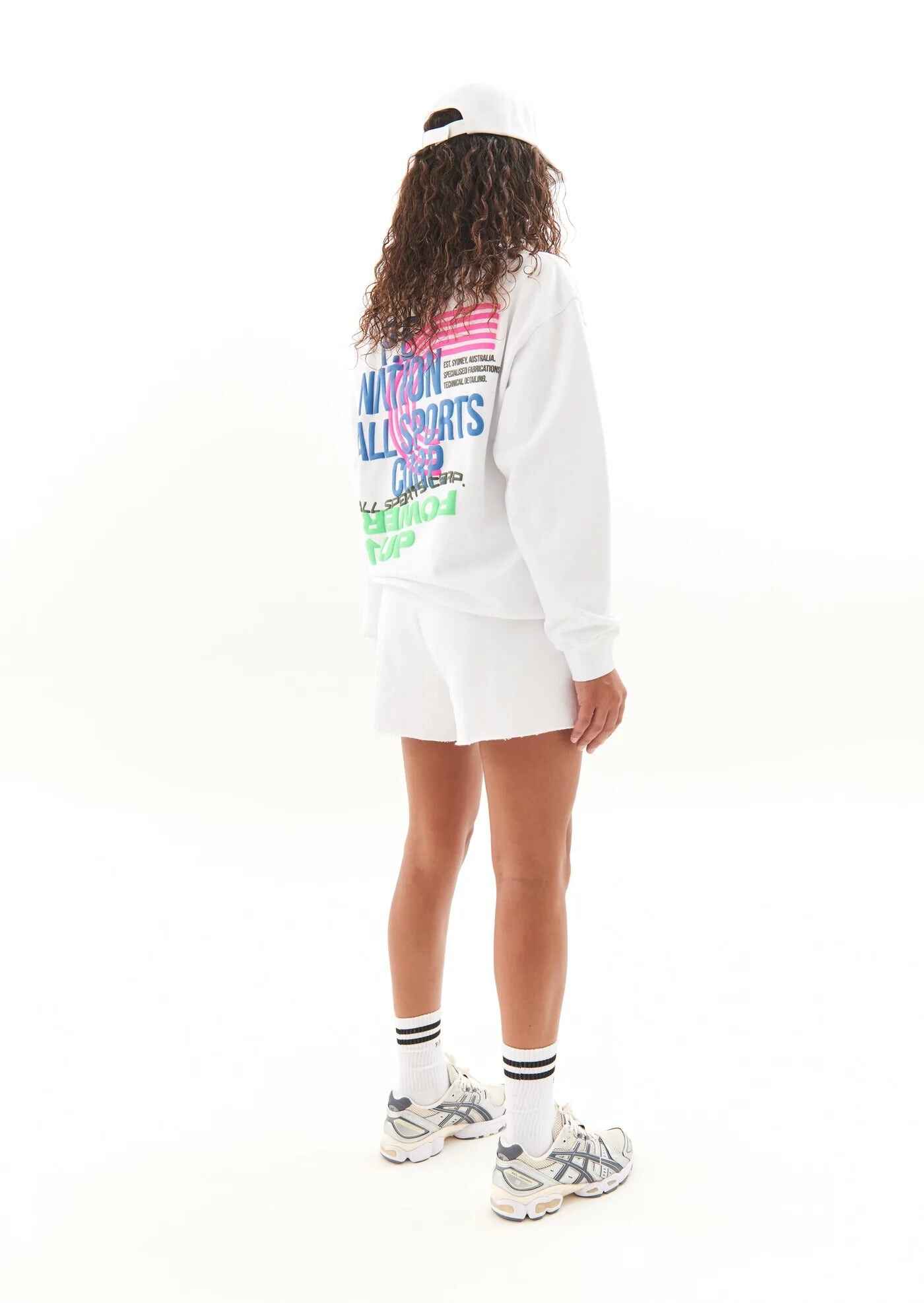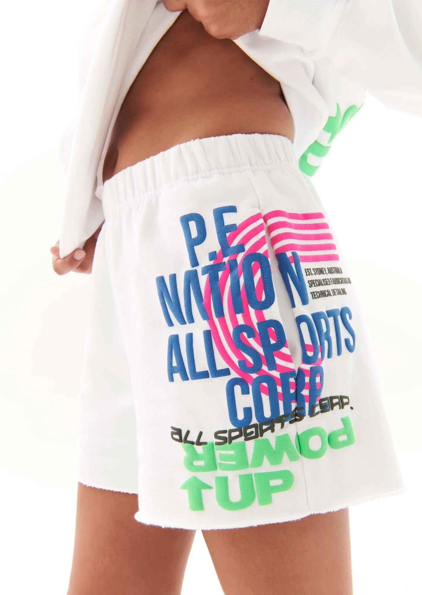 The Power Up Short in Optic White, is designed to inspire sky high energy, the pursuit of all passions, an appreciation for the power of now and the endless possibilities hidden within present time. A regular fit, mid-rise fashion short, the Power Up features hyper soft 96% organic cotton with a brushed fleece interior. Deep side seam pockets are matched with raw cut hem. Fluro logo and graphic puff print wrapping front to back provide signature P.E street-sport aesthetic. We recommend styling it with the Power Up Sweat and Power Up Tee from the collection.