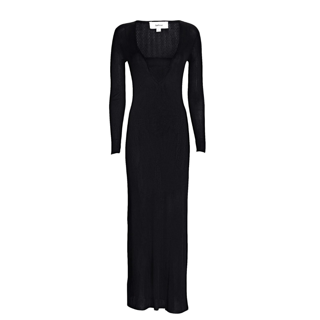 A full-length, long sleeve knitted dress, this style has a thigh-high split on the left leg and a deeply plunging neckline with a wide-knitted bar across the chest.