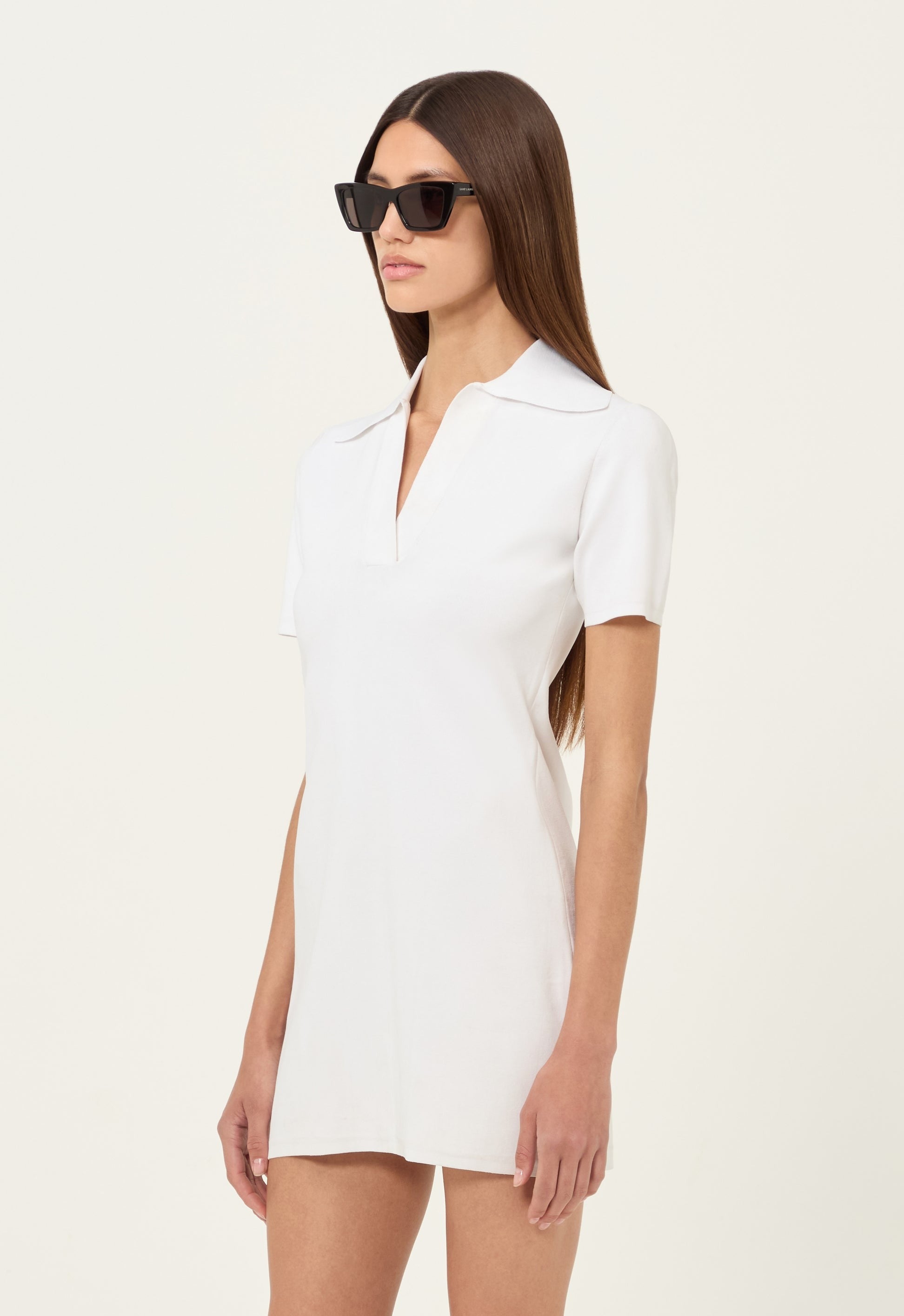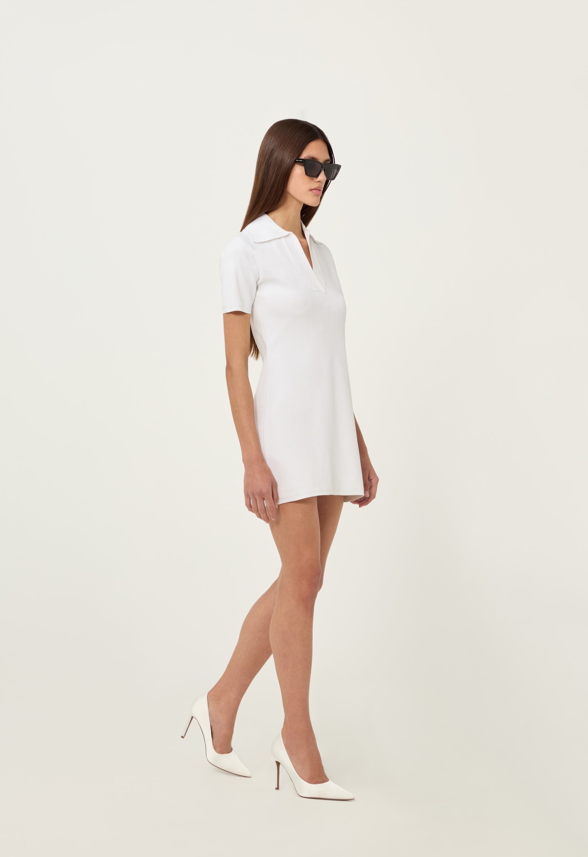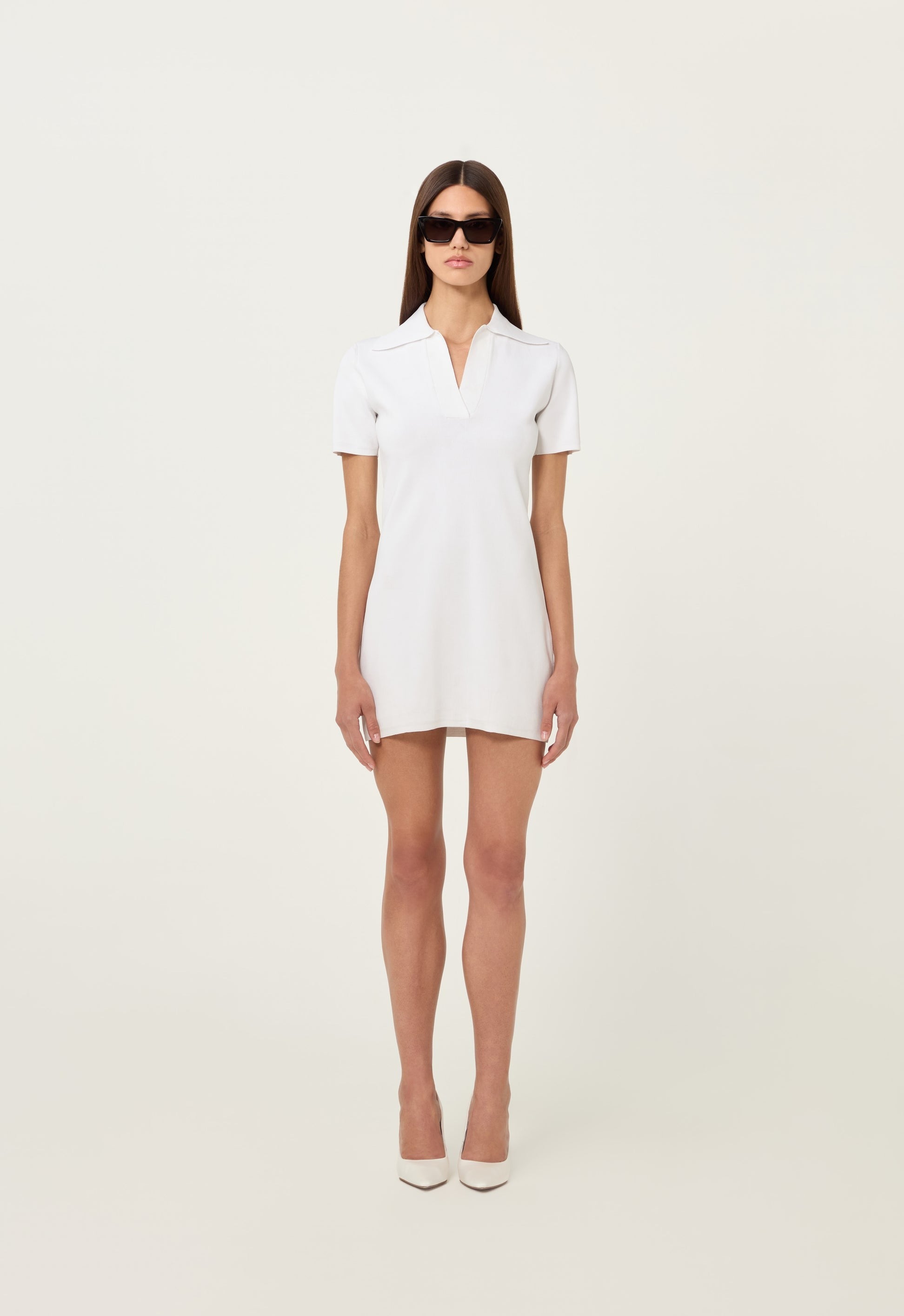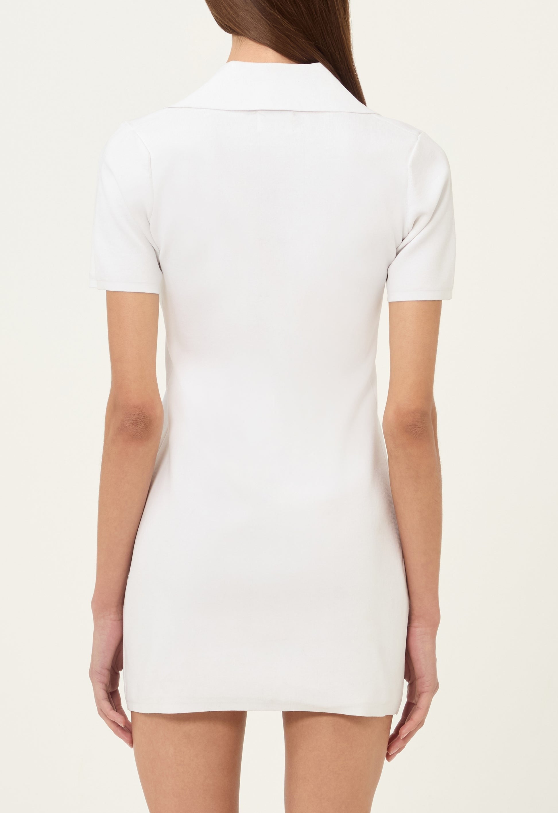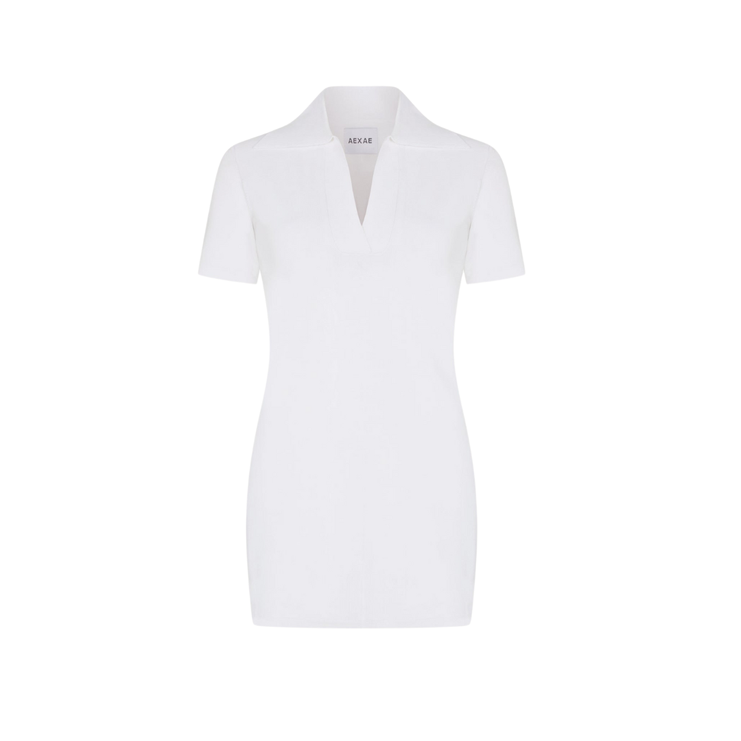 A mini dress fabricated in our signature technical knit construction designed to hold shape. Featuring a collared neckline and contoured waist.