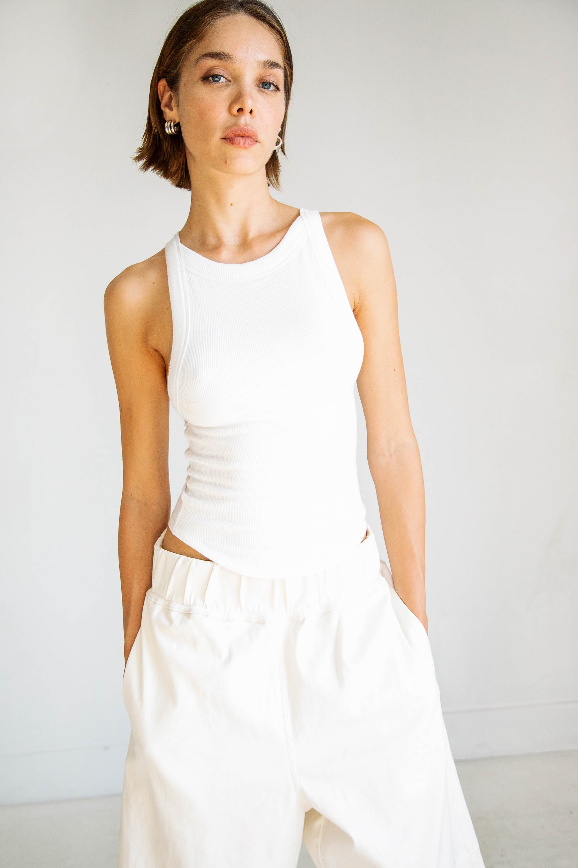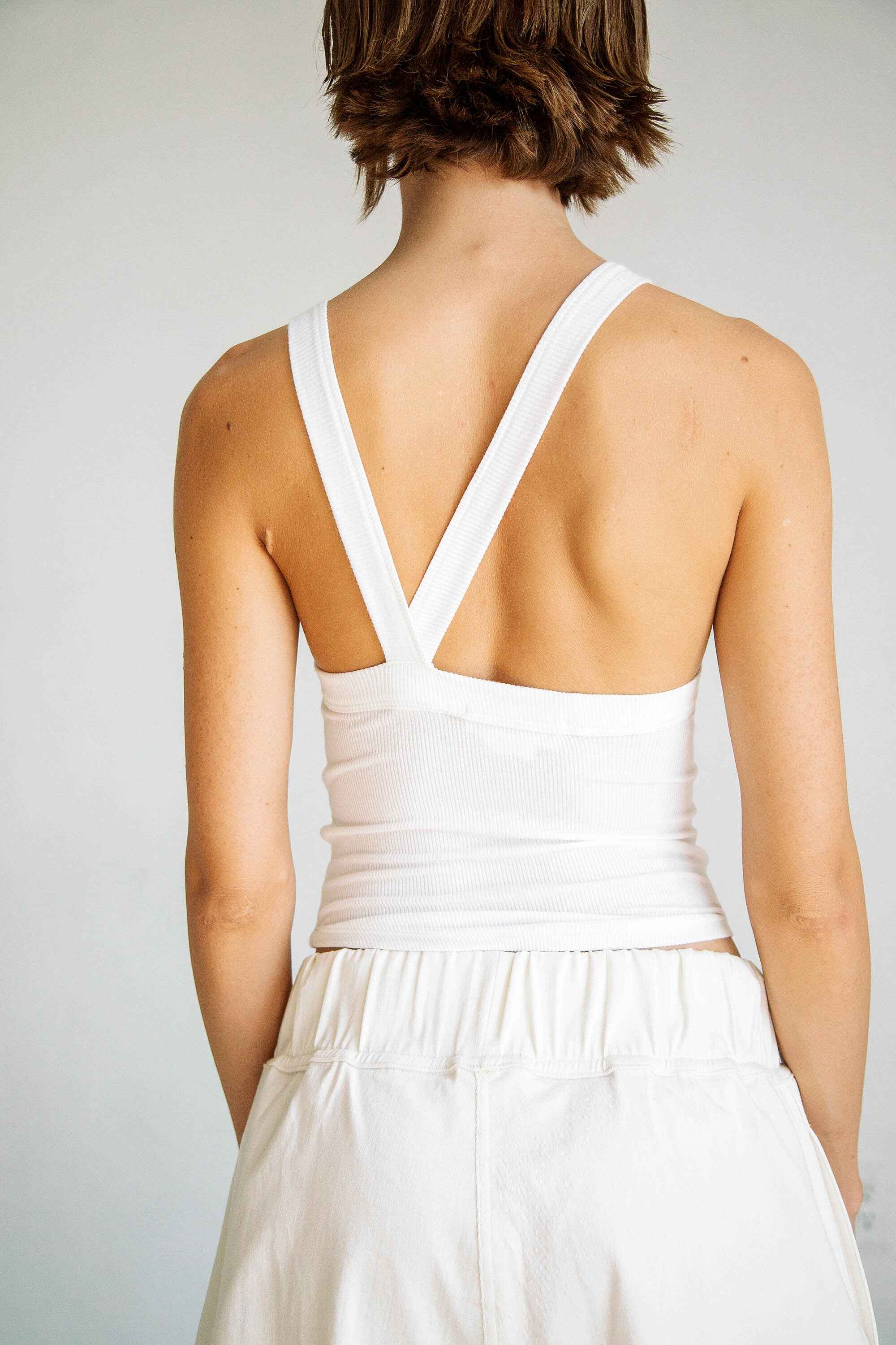 The Ximeno, crafted from the signature light-weight stretch-rib. It is cut for a close fit and features thick binding, asymmetric straps, a curved baseball hem and an open back. Pair with slinky slip skirts or oversized trousers.